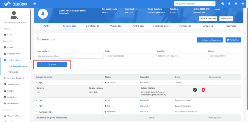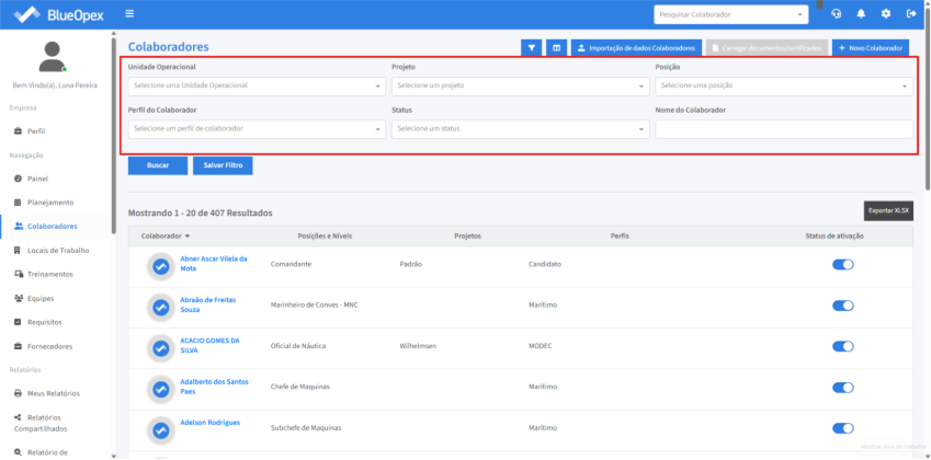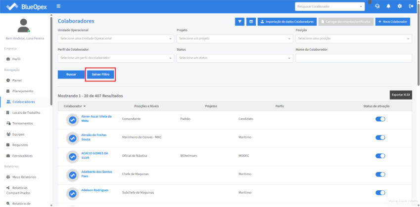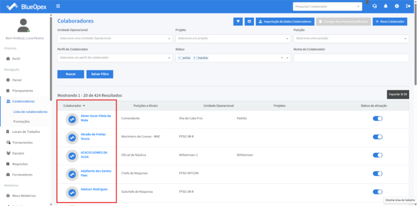 A listagem de colaboradores exibe os colaboradores ativos no sistema. Clique no ícone de filtro para refinar a busca.