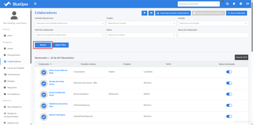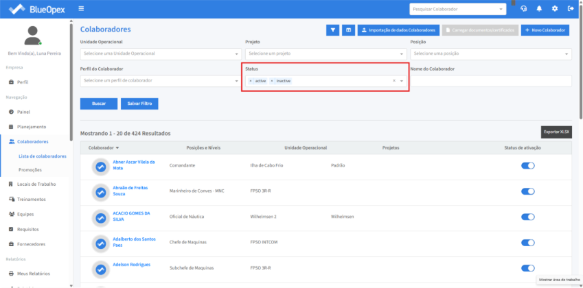 Para exibir os colaboradores ativos e/ou inativos no sistema utilize o campo “Status”