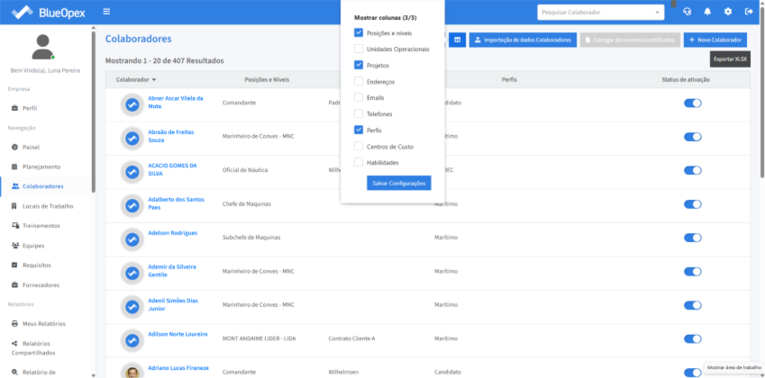 A solução apresentará uma modal com as informações de “Posições e níveis”, “Unidades Operacionais”, “Projetos”, “Endereços”, “Emails”, “Telefones”, “Perfis”, “Centros de Custos”, “Habilidades” que podem ser marcadas para estilizar as colunas apresentadas pelo sistema.