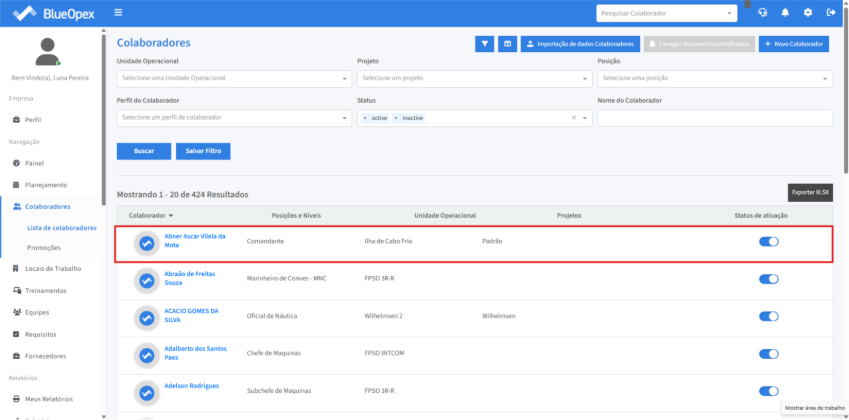 Em “Status de ativação” é possível verificar se o perfil do colaborador está ou não disponível no sistema. Para ativar/desativar um colaborador, clique no botão “Switch” na linha referente ao colaborador que deve receber esta ação.