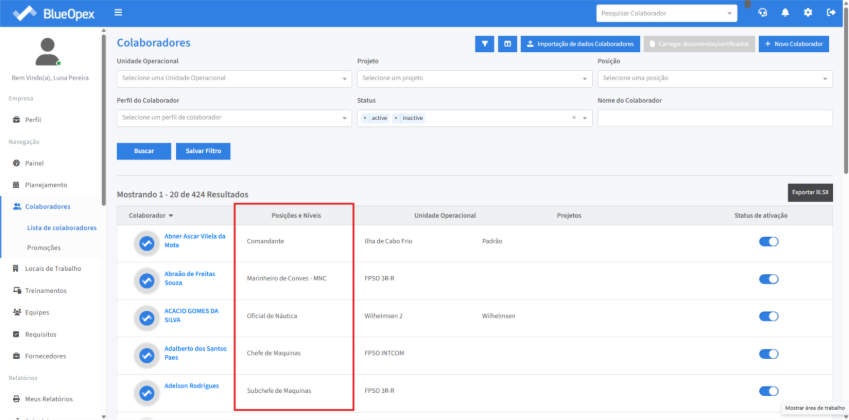 A coluna "Posições e Níveis" exibe a posição do colaborador de mesma linha.
