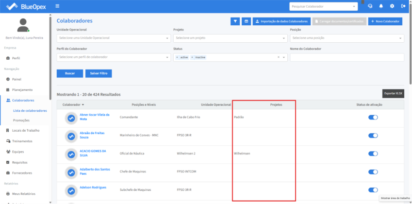Em “Projeto” é possível verificar em quais projetos o colaborador participa.