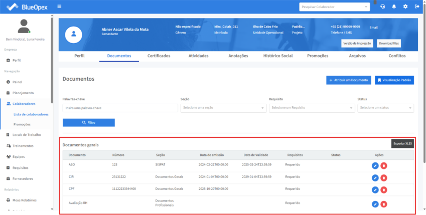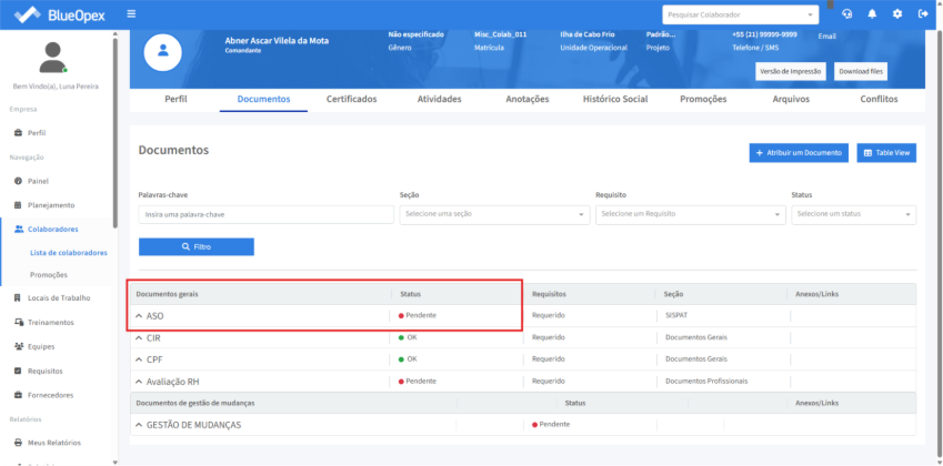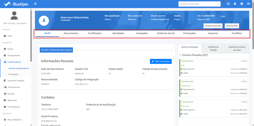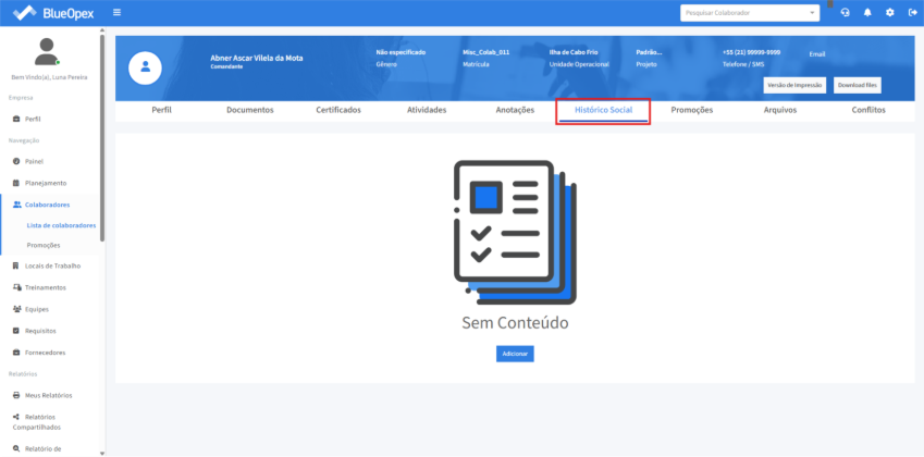 Clicando no perfil do colaborador desejado o sistema retornará uma página com 9 (nove) abas: “Perfil”, “Documentos”, “Certificados”, “Atividades”, “Anotações”, “Histórico Social”, “Promoções”, “Arquivos” e “Conflitos”.