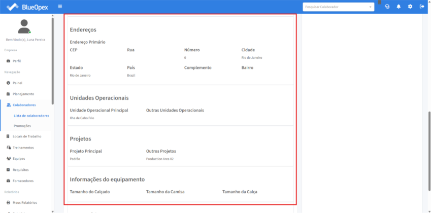 Também é possível registrar o endereço, os projetos em que o colaborador está associado e as informações sobre seus equipamentos.