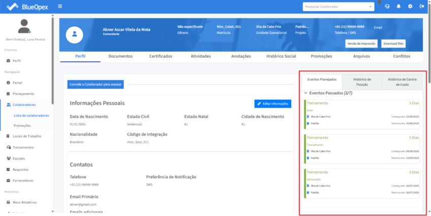 No card nomeado “Eventos Planejados” ao lado das informações do colaborador, é possível visualizar os últimos eventos que ocorreram em “Eventos Passados”, eventos planejados para acontecer futuramente em “Eventos futuros” e o evento atual que o colaborador está atuando em “Eventos atuais”.
