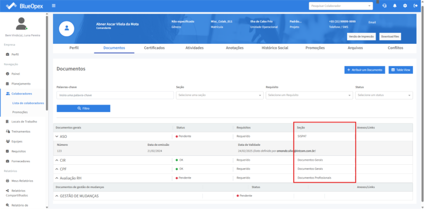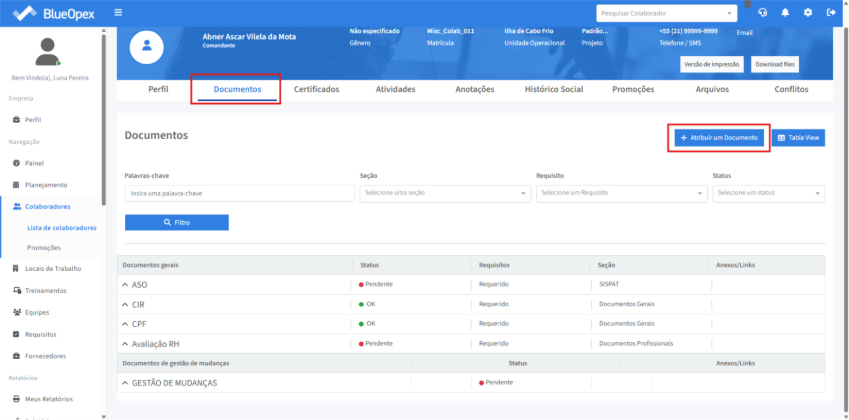Na aba Documentos são armazenadas informações dos documentos dos colaboradores. Os documentos poderão ser registrados através do clique no botão “Atribuir Documento”.