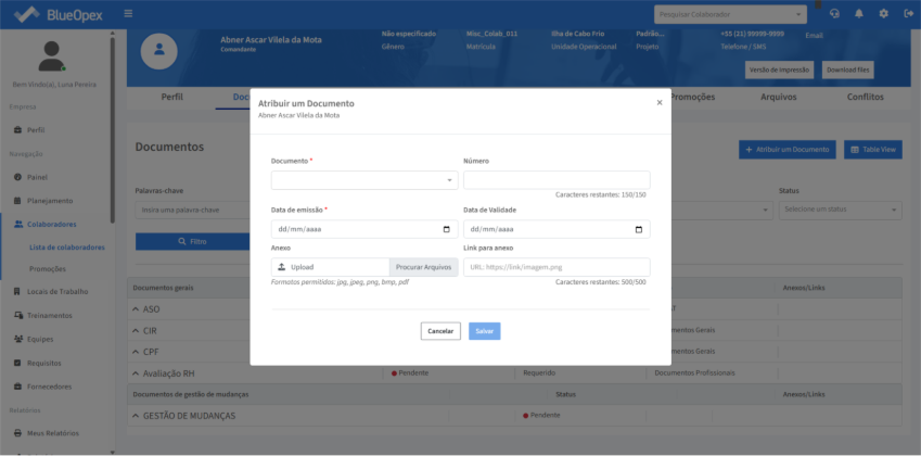 O sistema exibirá uma modal onde é possível preencher o nome do documento, número, data de emissão e validade do documento, e possível também adicionar um anexo para o documento.