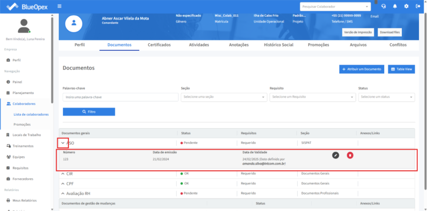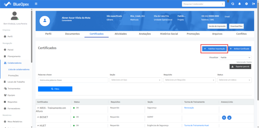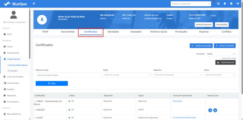 Na aba “Certificados” é possível gerenciar os certificados relacionados ao colaborador em questão.