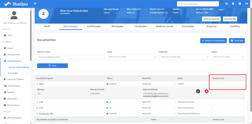 A coluna “Anexo/Links” lista o que foi anexado para determinado documento, podendo exibir um arquivo ou um link.