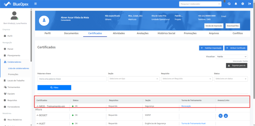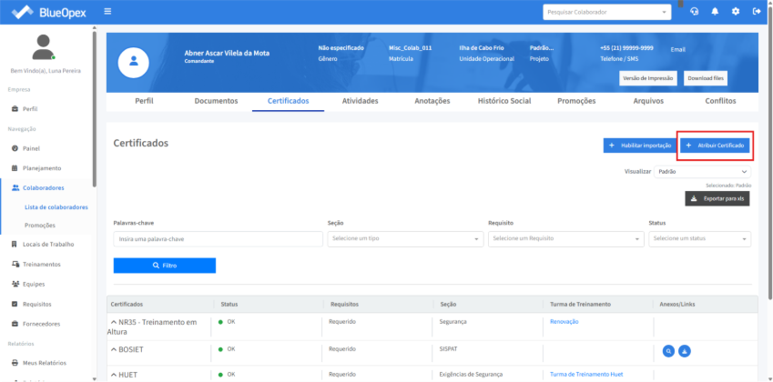 Através do clique no botão “Atribuir Certificado” é possível armazenar um certificado no perfil do colaborador adicionando informações como nome do certificado, número, data de emissão e validade, além de poder anexar um arquivo ao certificado.