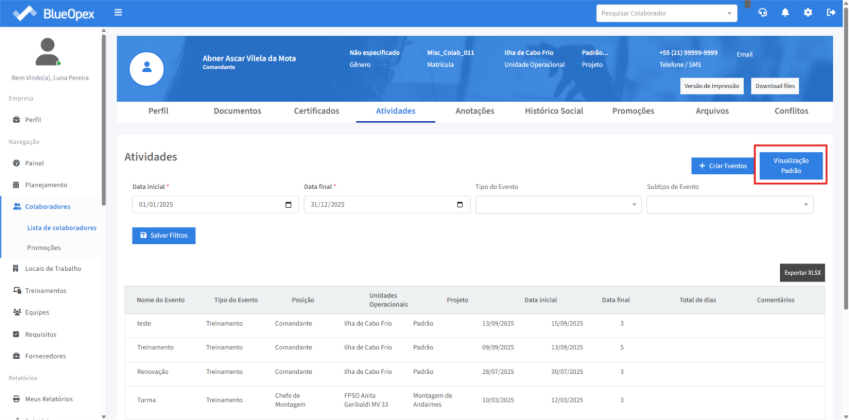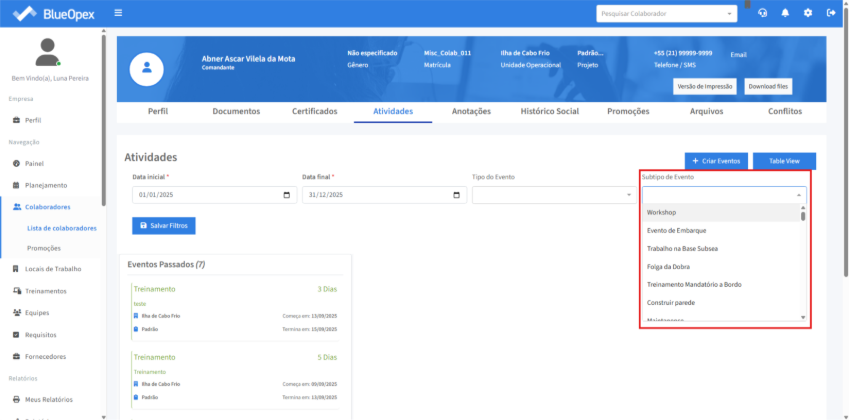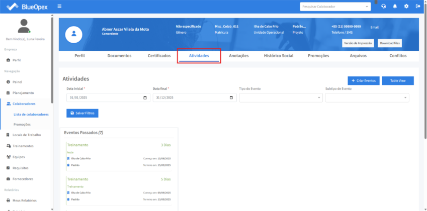 A aba “Atividades” lista as atividades que estão associadas ao colaborador desde que o colaborador possua pelo menos um evento registrado semelhante ao card de “Eventos Planejados” na aba “Perfil”.