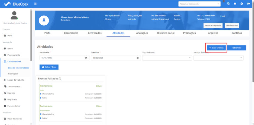 Na aba atividades também é possível lançar um evento individual para o colaborador. Para isso clique em “+ Criar Eventos”.