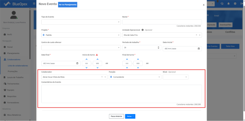 Preencha os campos “Colaborador”, “Posição”, “Nível” e, opcionalmente, “Comentários do Evento”.