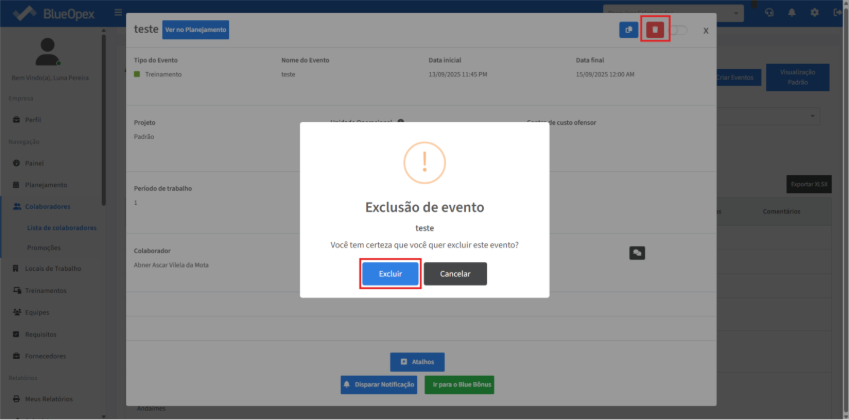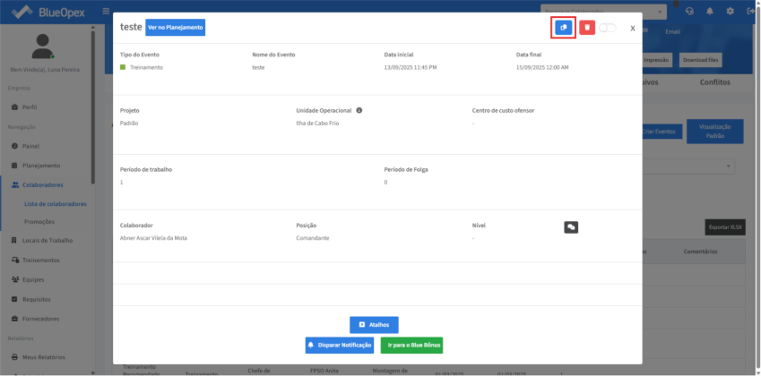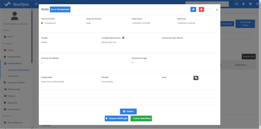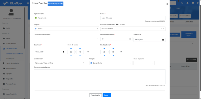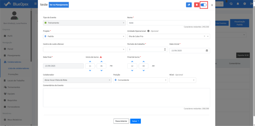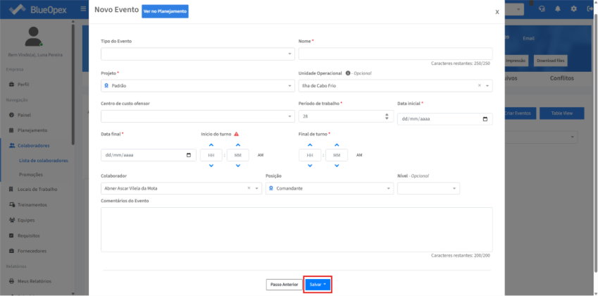 Será aberta uma modal com informações para serem preenchidas em relação ao “Tipo do Evento”, “Nome”, “Projeto”, “Unidade Operacional”, “Centro de custo ofensor” “Período de trabalho” “Data” e início e término do horário de turno.