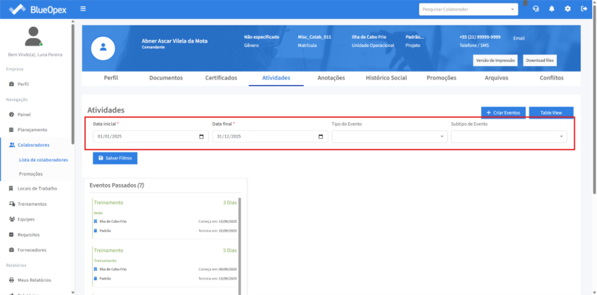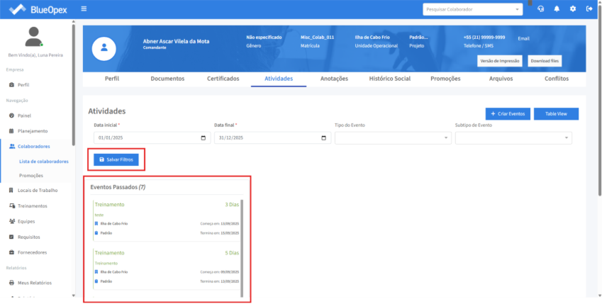 Clique em "Salvar Filtros" para guardar as informações de busca e o sistema apresentará um card com os eventos passados relacionados ao colaborador.