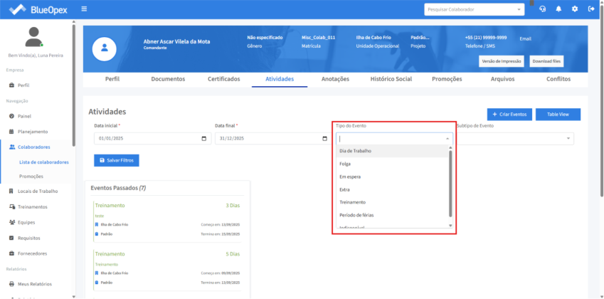 Os eventos do colaborador podem ser filtrados por tipos, como “Dia de Trabalho” e “Folga”