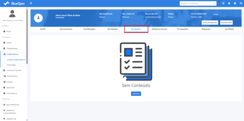 A aba “Anotações” permite lançar anotações referente ao colaborador na página referente ao mesmo.