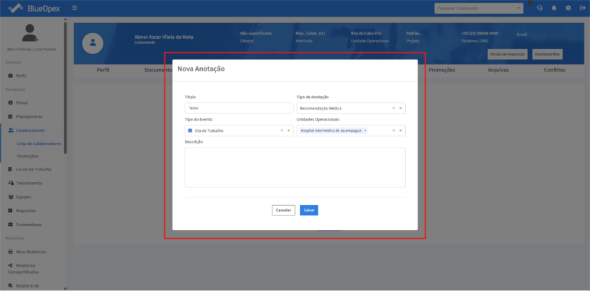 Ao adicionar uma nova anotação, um modal surgirá com campos de contextualização da nota e uma descrição da mesma. Nele, é possível destacar informações a respeito do colaborador como cuidados especiais, alergias, recomendações médicas e entre outros.
