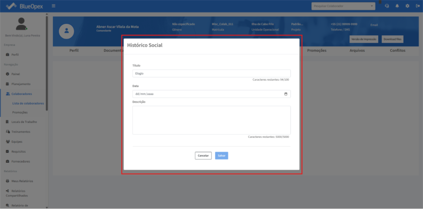 Na seção “Histórico Social”, similar às anotações, é possível adicionar notas ao perfil do colaborador a respeito de seu comportamento.