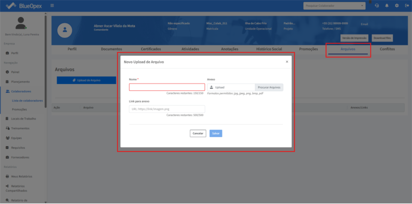 Em “Arquivos” é possível fazer o upload de arquivos/anexos dentro do perfil do colaborador, em uma aba geral separada de certificados e documentos.