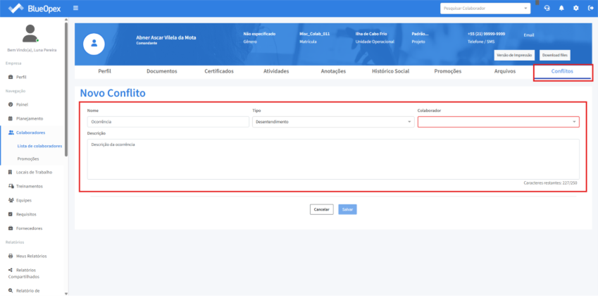 A seção “Conflitos” tem como funcionalidade destacar conflitos entre funcionários, permitindo que sejam selecionados os colaboradores envolvidos e uma descrição da ocorrência.