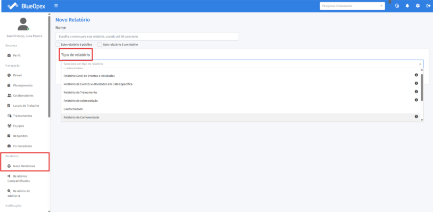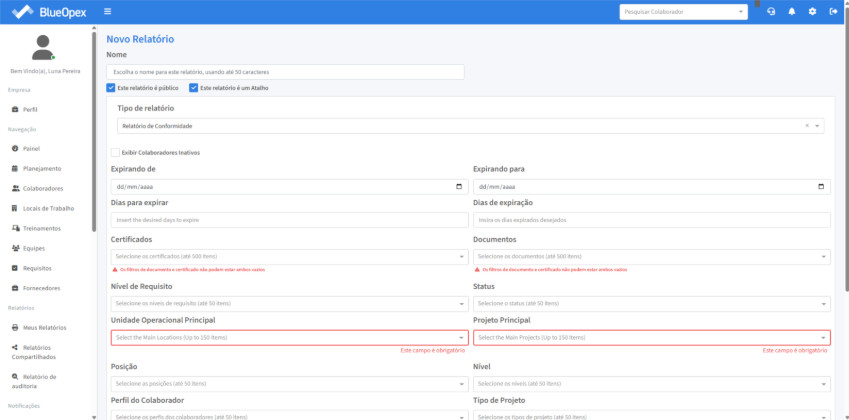 Ainda na criação do novo requisito, o primeiro passo é definir o nome do relatório e os filtros.