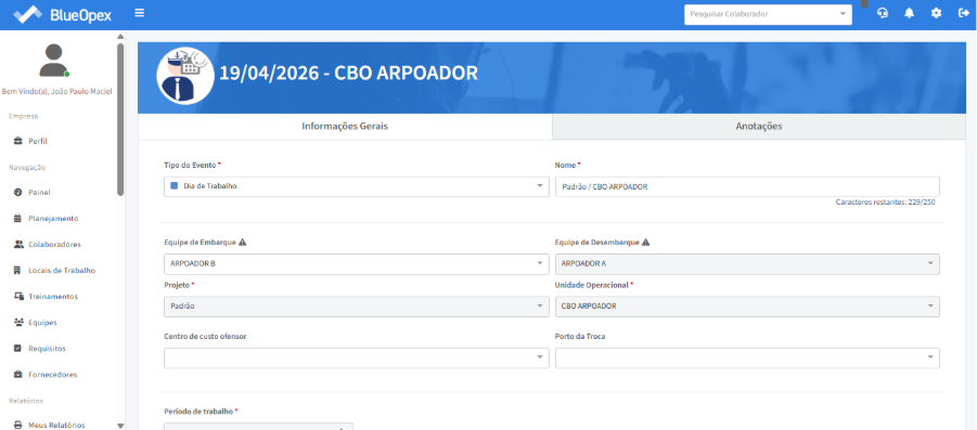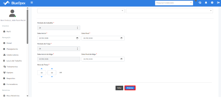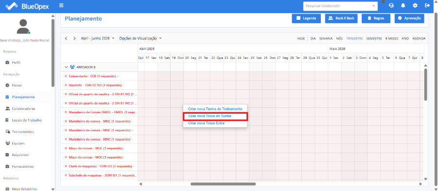 A troca de turma ocorre quando uma equipe encerra seu turno a bordo e é substituída por outra. No BlueOpex 2.0, isso se traduz no registro do início do período de trabalho da equipe embarcante e da folga da equipe desembarcante.