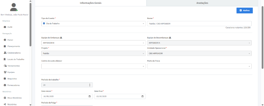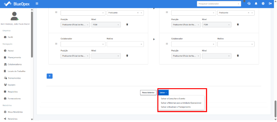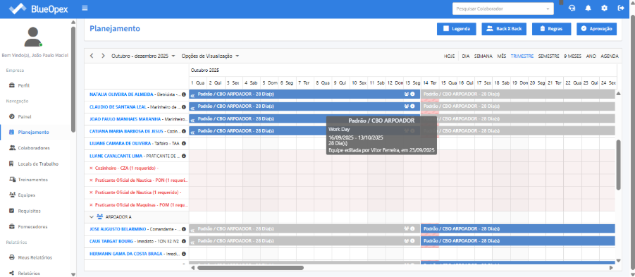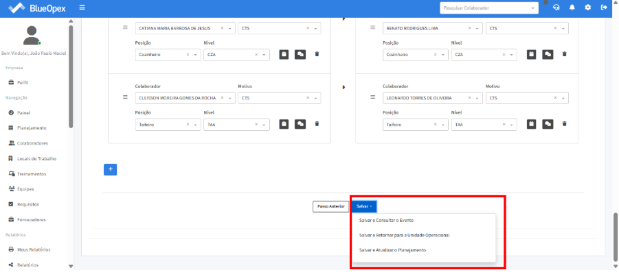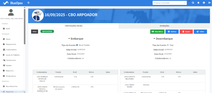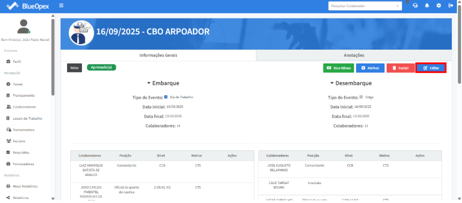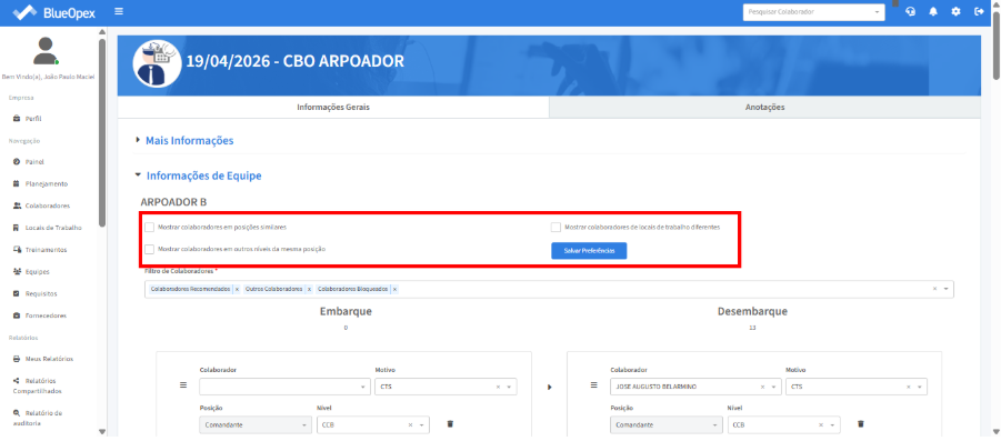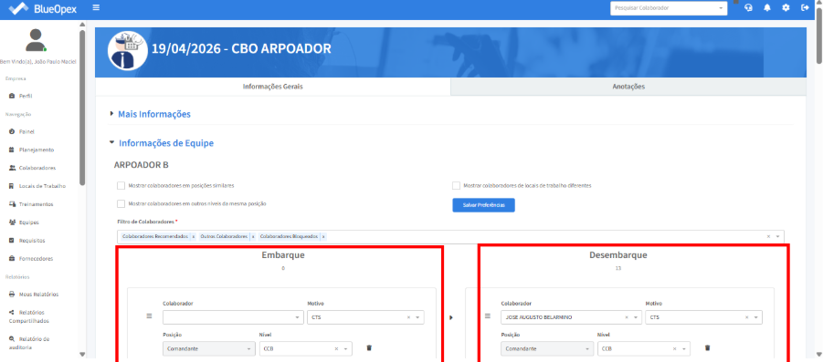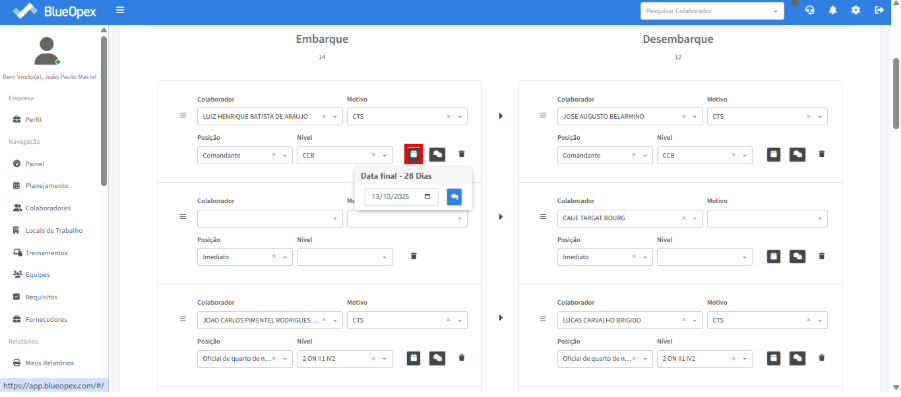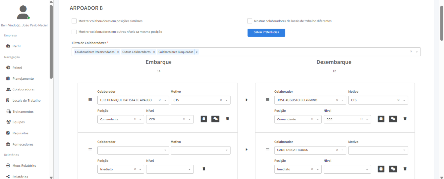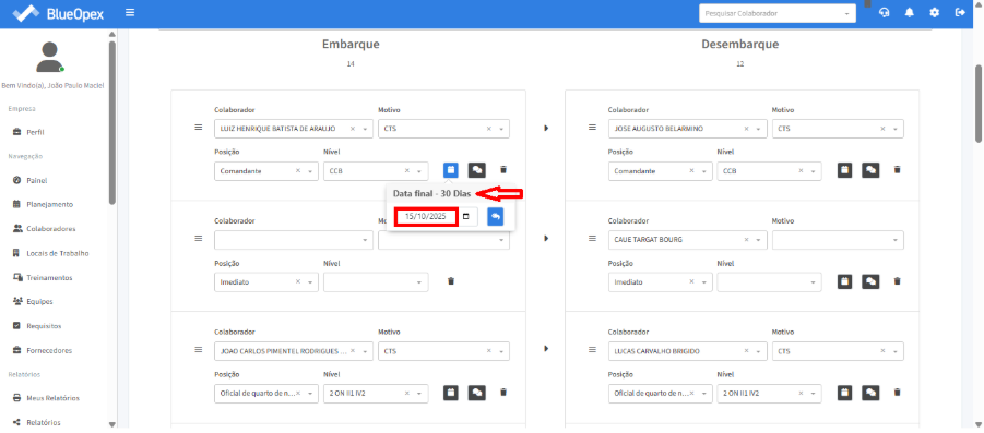 O próximo passo é preencher as posições exigidas na equipe com os colaboradores correspondentes. A tabela à direita mostra a equipe que irá embarcar, enquanto a tabela à esquerda exibe a equipe que desembarcará no mesmo período.