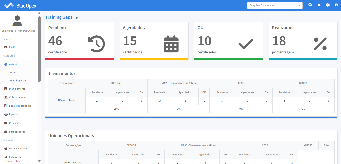 O Training Gaps traz um painel detalhado sobre a conformidade de treinamentos e certificados da equipe.
