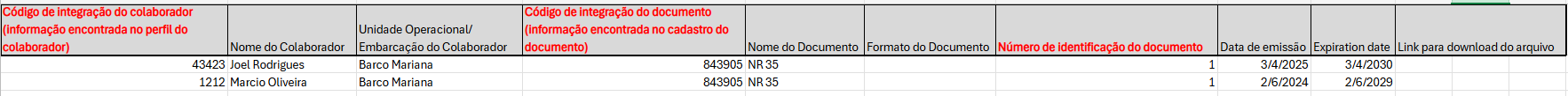 Cada linha da planilha deve representar um documento ou certificado específico de um colaborador. Certifique-se de preencher corretamente todas as informações relacionadas a cada colaborador.