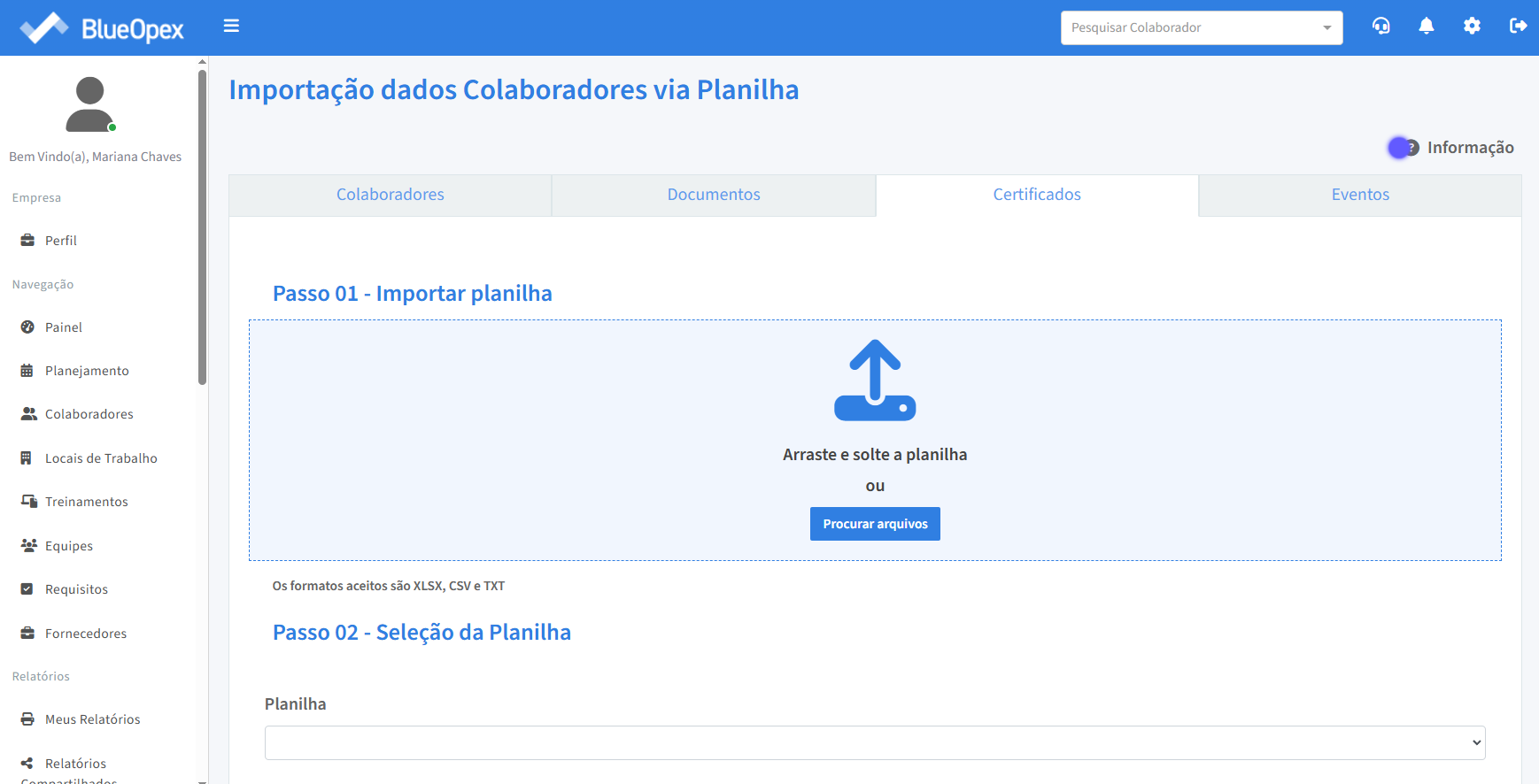 A carga dos Certificados e Documentos dos Colaboradores será realizada através da Importação de dados dos Colaboradores. Após a importação dos dados, o perfil dos colaboradores exibirão os Certificados e Documentos conforme preenchido na planilha.