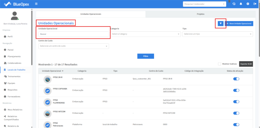 Na tela de “Unidades Operacionais”, o usuário tem acesso ao perfil de todas as unidades cadastradas no sistema. Para facilitar a busca por uma unidade específica, é possível utilizar o ícone de “Filtro”. Ao clicar no botão de filtro, o sistema disponibiliza opções de pesquisa que permitem buscar e selecionar rapidamente a unidade operacional desejada.