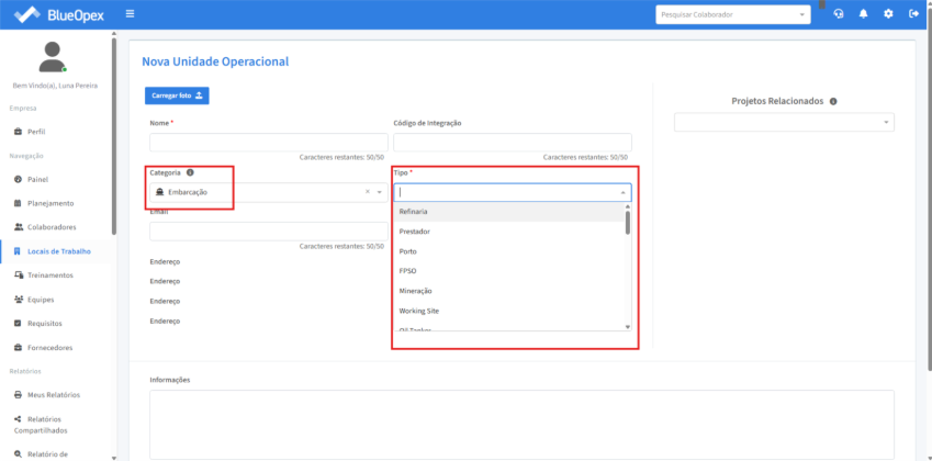 Na nova tela aparecerão os campos para preencher as informações gerais de acordo com a Unidade Operacional selecionada, se for selecionada uma categoria "Embarcação", campos para preenchimento de informações de Embarcações serão exibidos. Unidades Operacionais de outras categorias, exibirão campos específicos para as categorias selecionadas. Após preencher clique em "salvar" no final da tela.