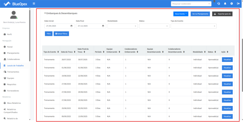 Exibe os colaboradores que estão embarcados em um evento ativo (dia de trabalho, extra ou subtipo) na data selecionada no filtro. Colunas exibidas: Data de Embarque, Nome do Colaborador, Posição, Data de Desembarque Previsto, Modalidade do Evento, Dias até a Data, Dias Remanescentes, Total Previsto e Ações (editar evento).