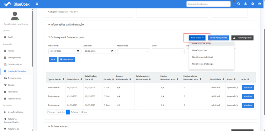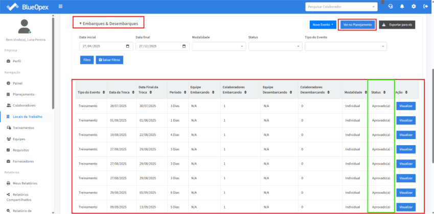 Status (Pendente, Aprovado, Negado) de um evento: Nesse espaço, é possível visualizar informações detalhadas sobre cada embarque e desembarque, incluindo a coluna “Status”, que indica em tempo real a situação de cada atividade vinculada à embarcação. Clicando em Planejamento, o usuário é redirecionado a tela de Planning, a qual pode-se visualizar os eventos na linha do tempo.