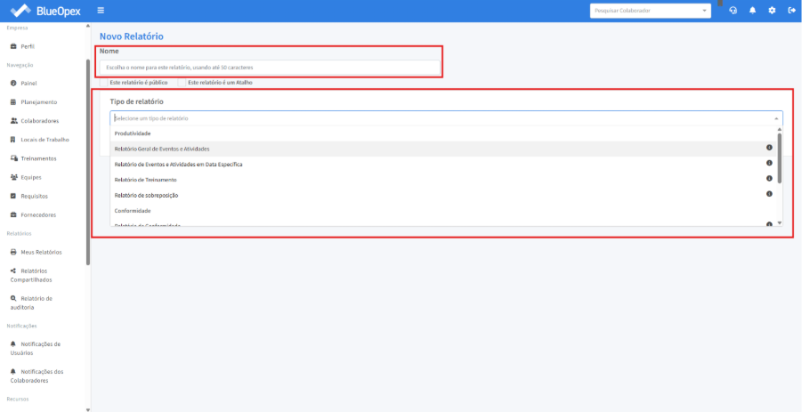 Nas checkboxes “Esse relatório é público” e “Este relatório é um atalho” é possível definir como este relatório aparecerá definindo se pode ser acessado por todos os usuários (sendo um relatório público) e definindo se o relatório em questão aparecerá em eventos vinculados (se for um atalho):