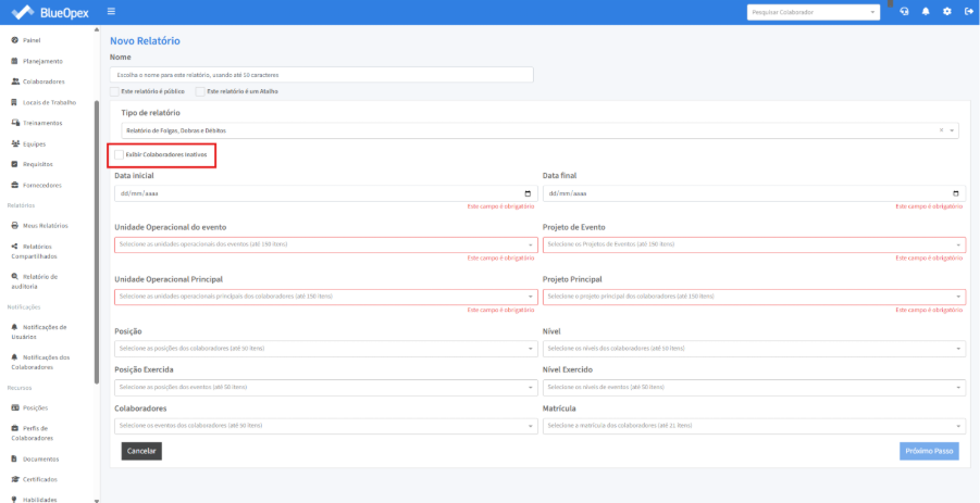 A opção “Exibir colaboradores inativos” é opcional e pode ser utilizada para mostrar colaboradores que não estão mais vinculados a empresa: