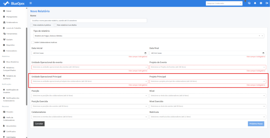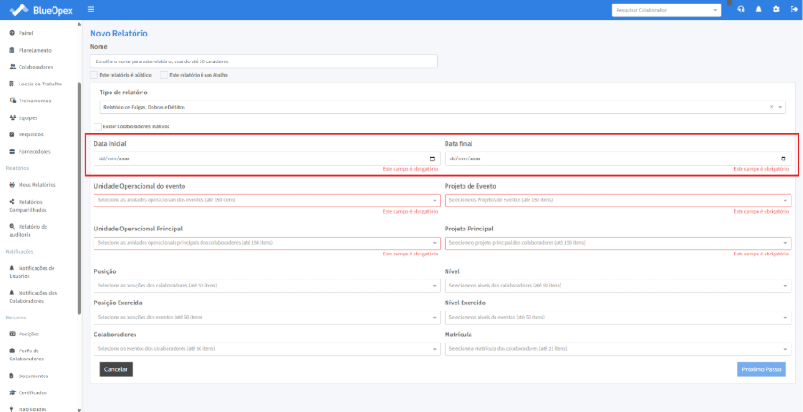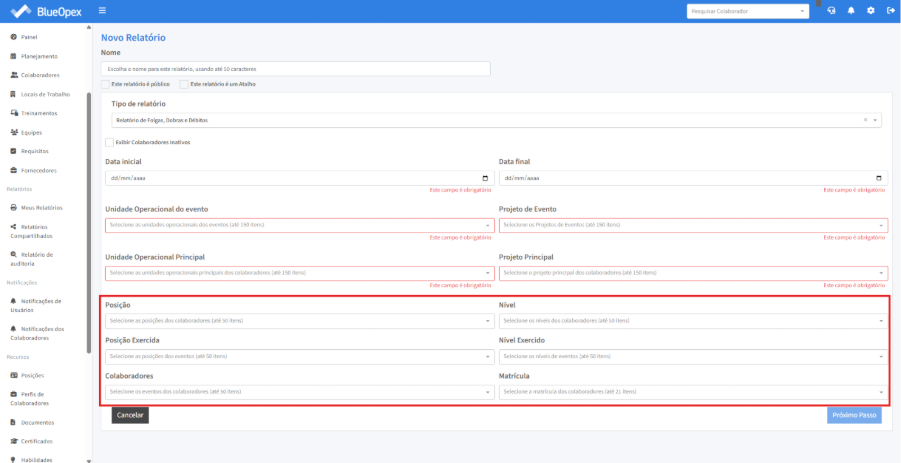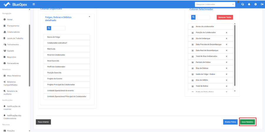 Escolha um nome e em seguida selecione o “Relatório de Folgas, Dobras e Débitos” em “Tipos de Relatórios”: