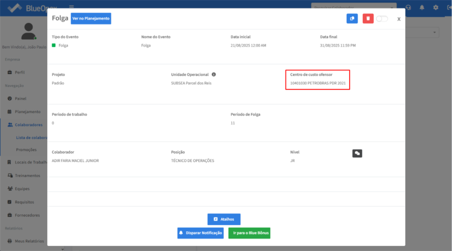 O campo Centro de Custo Ofensor foi implementado no BO2 para permitir a correta alocação de despesas em eventos custeados por centros de custo diferentes do principal do colaborador ou da embarcação.