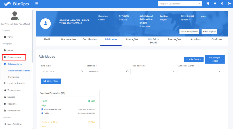 Com a página de Atividades aberta, é possível visualizar todos os eventos individuais em que o colaborador participou. Para acessar os detalhes de um evento específico, basta clicar sobre ele na lista exibida.