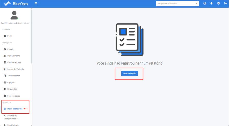 Para isso, utilize o menu lateral e acesse a seção “Relatórios”. Dentro dela, clique em “Meus Relatórios” e, em seguida, selecione o botão “Novo Relatório”.