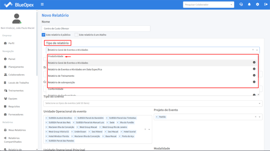 Atualmente, o campo Centro de Custo Ofensor só pode ser incluído em relatórios do tipo “Produtividade”. Portanto, selecione esse tipo de relatório e, em seguida, preencha os campos necessários para seguir para o próximo passo.