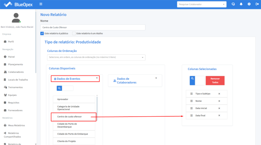 A partir desse passo, você poderá selecionar as colunas que estarão disponíveis no relatório. O campo que estamos procurando, “Centro de Custo Ofensor”, está localizado dentro da aba “Dados de Eventos”. Para incluí-lo, basta arrastar o campo até a seção “Colunas selecionadas”.