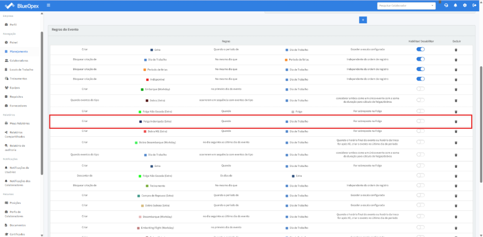 Para que a regra seja aplicada automaticamente, é necessário que ela seja ativa ainda na mesma página de “Regras”. Para isto, busque por “Folga indenizada (Extra)” na parte debaixo da página e habilite a regra.
